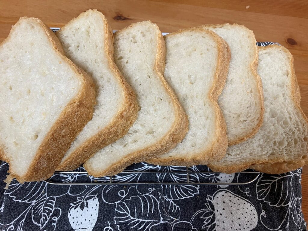 食パンをすぐにスライスできない→1時間以上冷まさないと、きれいにスライスができない。これは焼き色を「濃」にすれば表面がかっちりとなり、あったかいうちにスライスしても大丈夫ということが分かりました。